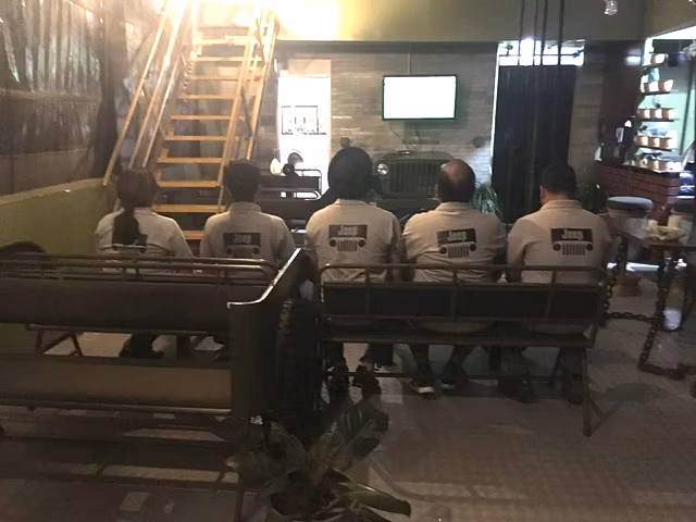 The Cafe was designed with every details around the corner associated to the parts of JEEP. The swing seatings, benches resembling the rear seating of Willys, chairs with shock absorbers, bar stools from the tyre rims and the most highlighted one at the wash room - the wash basin made of inverted Engine / Gear Box with a steering tap, the mirror housed on the collapsible wind screen of JEEP Willys are a few to name… believe it or not there are much more to dig out.